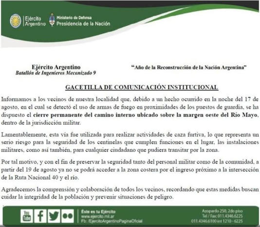 El Batallón de Ingenieros Mecanizado 9 justificó el cierre en un comunicado, alegando que se detectó el uso de armas de fuego cerca de los puestos de guardia y mencionó riesgo de “caza furtiva”. Sin embargo, el Código de Aguas provincial establece que las riberas son de dominio público y que el acceso debe estar garantizado.