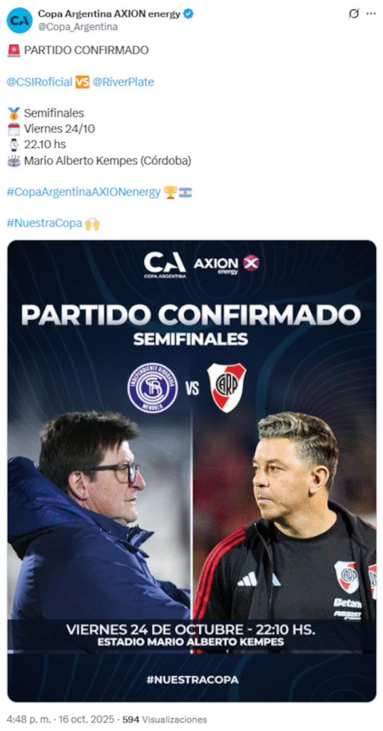 Ya no hay más especulaciones. Las semifinales de Copa Argentina tienen hora, día y sede confirmada. De esta manera, River Plate, único de los cinco equipos grandes que sigue en competición, buscará el pase a la final el próximo viernes 24 de octubre desde las 22:10 en el Estadio Mario Alberto Kempes de Córdoba ante Independiente Rivadavia.