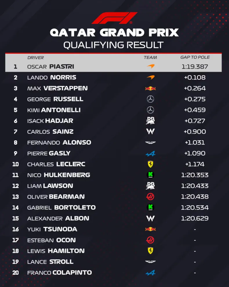 En plena disputa del campeonato, Piastri se quedó con la pole position, Norris y Verstappen fueron segundo y tercero, respectivamente.