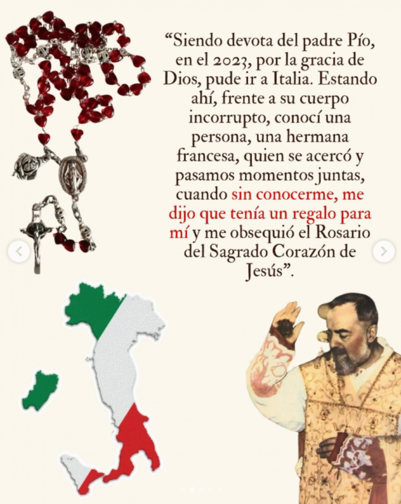 En ese lugar sagrado conoció a una hermana francesa con quien compartió momentos de oración y diálogo. Sin conocerse previamente, aquella mujer se acercó y le dijo que tenía un regalo para ella: un Rosario del Sagrado Corazón de Jesús.
