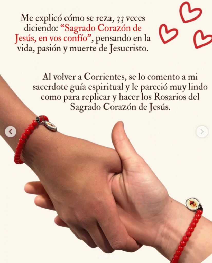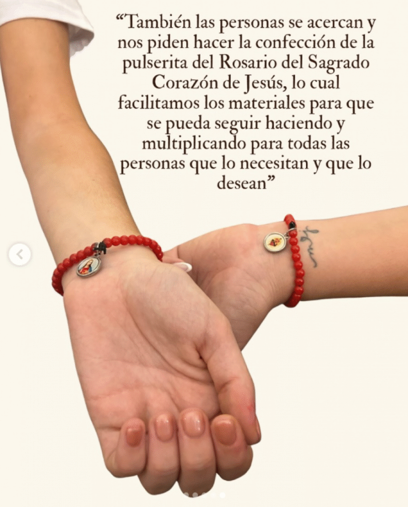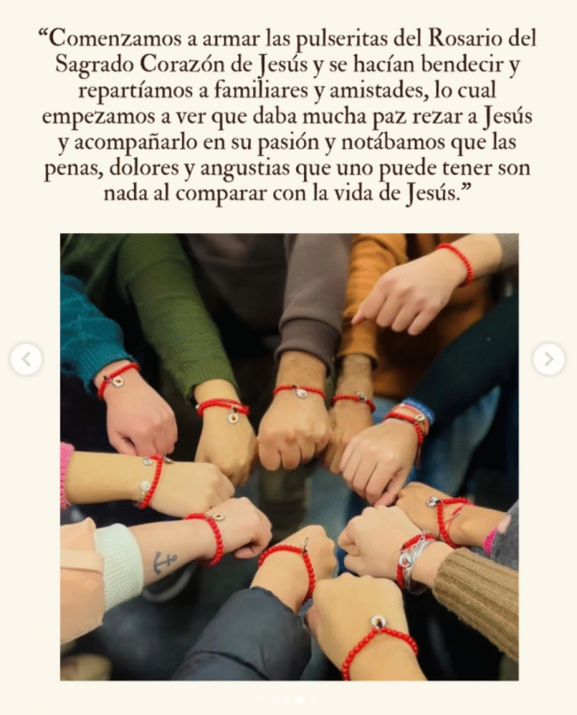 A través de la cuenta de instagram @corazonesperegrinos_ contaron que así nacieron las pulseritas rojas del Rosario del Sagrado Corazón de Jesús. Se empezaron a confeccionar de manera artesanal, se bendecían y se repartían entre familiares y amistades.