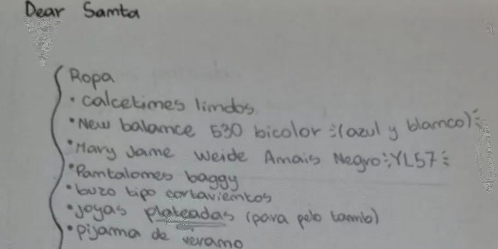 La carta no fue una lista improvisada. La adolescente de 15 años estructuró sus pedidos navideños por rubros: ropa, maquillaje y hobbies. Dentro de cada sección, detalló con claridad lo que deseaba. Por ejemplo, en la parte de ropa pidió “calcetines lindos”, diferentes tipos de zapatillas, “pantalones baggy, chaqueta tipo cortavientos, joyas plateadas” y hasta “pijamas de verano”.