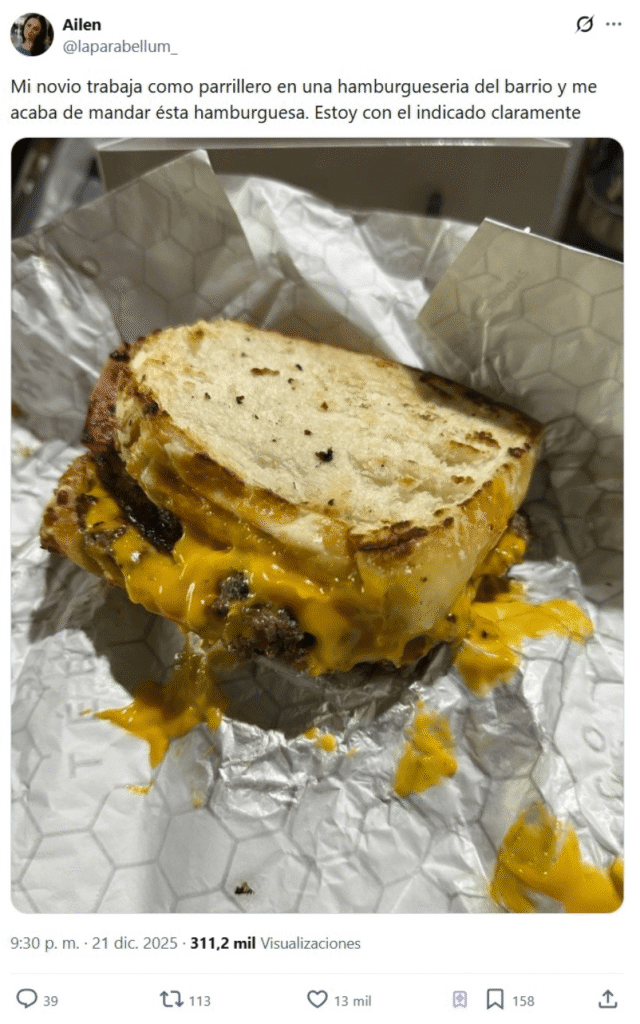 Los mensajes continuaron multiplicándose: “Emociona que esté contenta de estar con un parrillero en un mundo donde todas buscan guita o fama. Buena mina”; “Amor, es la hamburguesa más depresiva que vi en mi vida”; y “Pensé que te la había llevado al menos”.